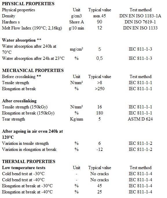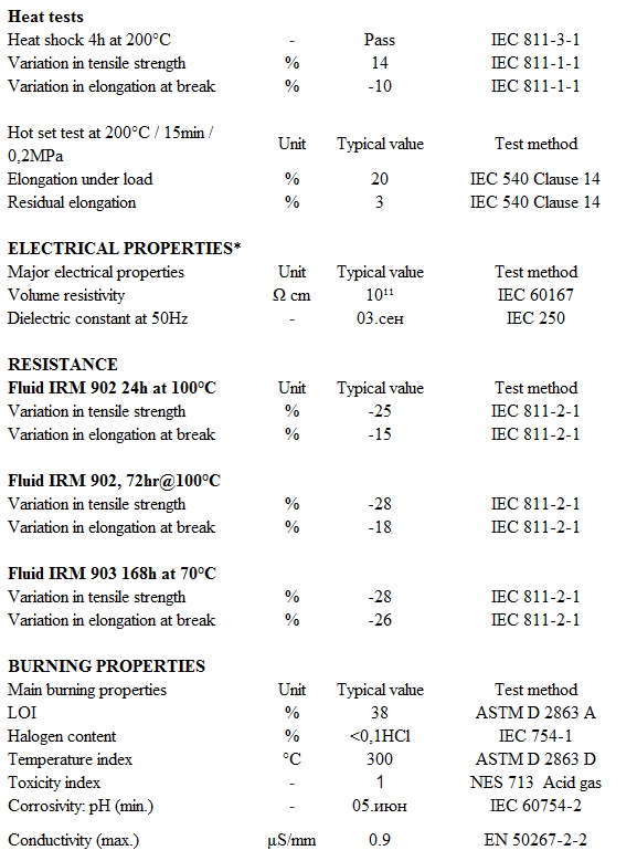 Применение: Рекомендуемый материал может быть идеальным решением для приложений, таких как коаксиальных кабелей, кабелей используемых в электронной промышленности, кабелей связи, силовых кабелей низкого напряжения, измерительных приборов и кабелей управления в жестких условиях окружающей среды