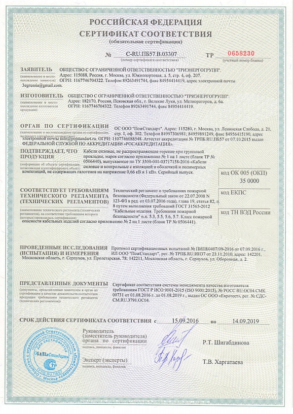 Класс пожарной опасности по ГОСТ 31565-2012: