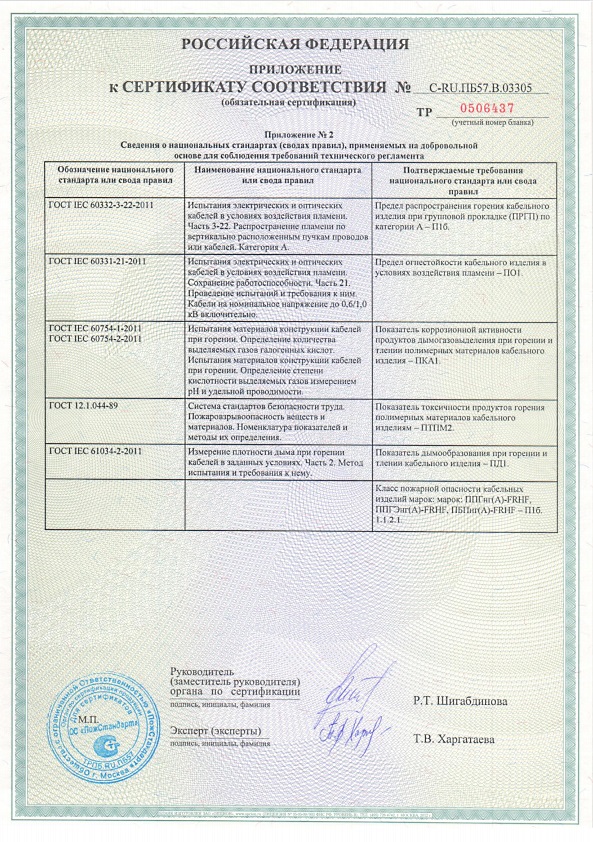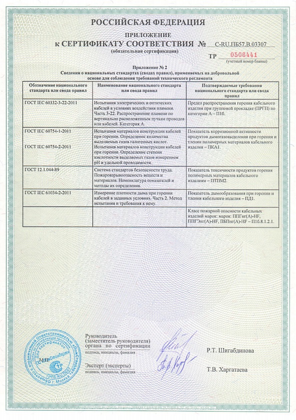 * Примечание: для изоляции, внутренней и внешней оболочек (защитного шланга) применяются специальные композиции ПВХ пластикатов пониженной пожарной опасности, с низким дымо- и газовыделением, низкой токсичностью продуктов горения.